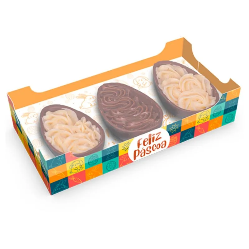 Possui um design alegre e exclusivo que valoriza os produtos e atrai a atenção dos clientes. Ideal para degustações ou presentes, essa embalagem é uma opção prática e charmosa para tornar suas delícias ainda mais especiais nesta Páscoa.