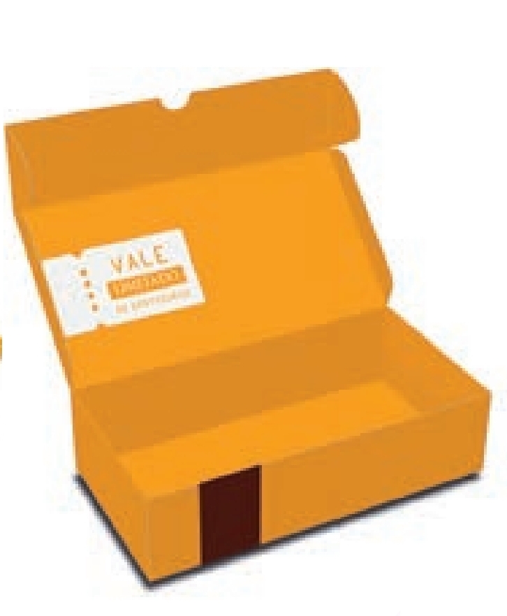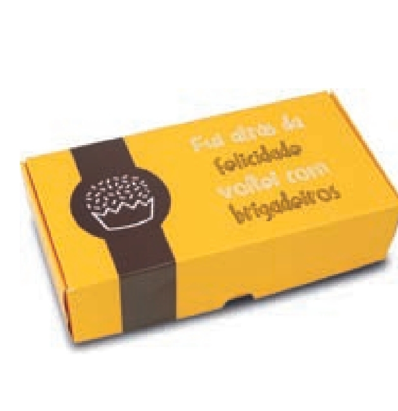 Caixa amarela com texto e imagem de brigadeiro
