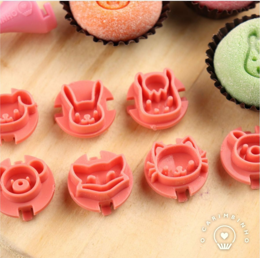 O Kit Carimbos para Brigadeiros Bichinhos é composto por 9 (nove) peças, sendo 2 (duas) bases de fixação e as cabeças para marcação com os símbolos, coelho, porco, cachorro, urso, gato, raposa, cavalo.