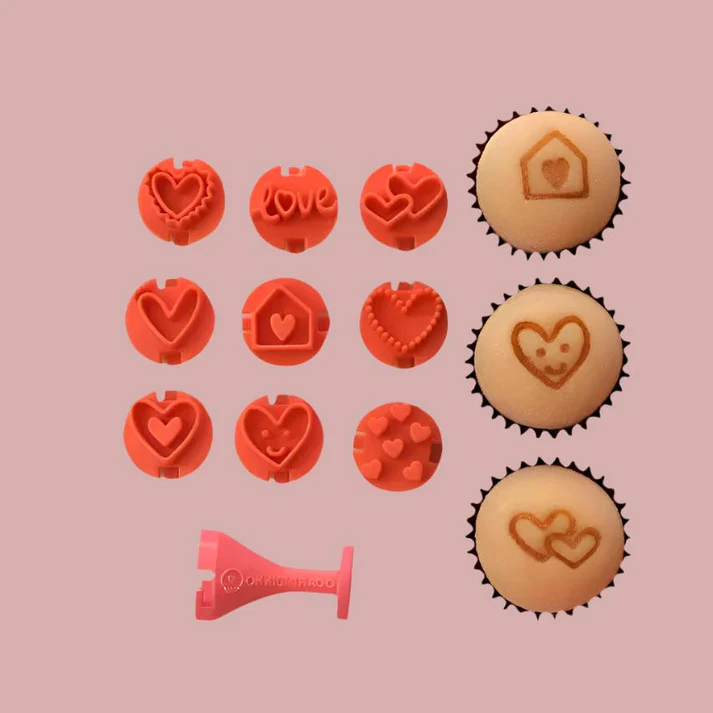 O Kit Carimbos para Brigadeiros Corações é composto por 10 (dez) peças, sendo 1 (uma) base de fixação e as cabeças para marcação com corações diversificados. Com ele você fará marcações diretamente no brigadeiro a ser decorado.