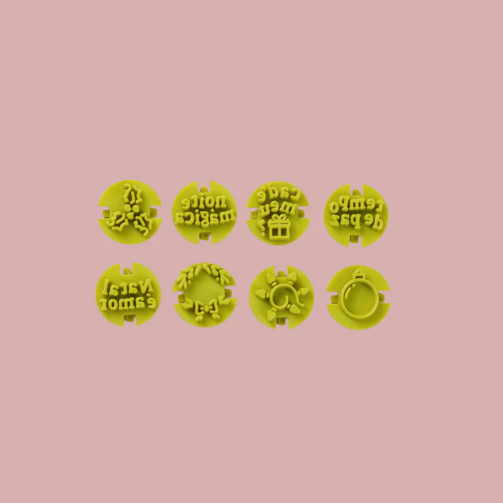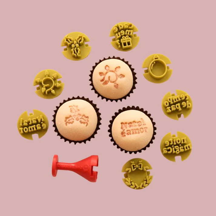 O Kit Carimbos para Brigadeiros Natal 2 é composto por 9 (nove) peças, sendo 1 (uma) base de fixação e as cabeças para marcação com as figuras pisca pisca, guirlanda, bola de natal, visco de natal e as frases cadê meu presente, noite mág ica, natal é amor e tempo de paz. Com ele você fará marcações diretamente no brigadeiro a ser decorado.